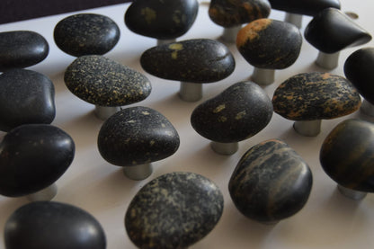 These natural stone drawer knobs feature smooth, dark basalt and granite stones set on a high-quality, silver anodized aluminum base.