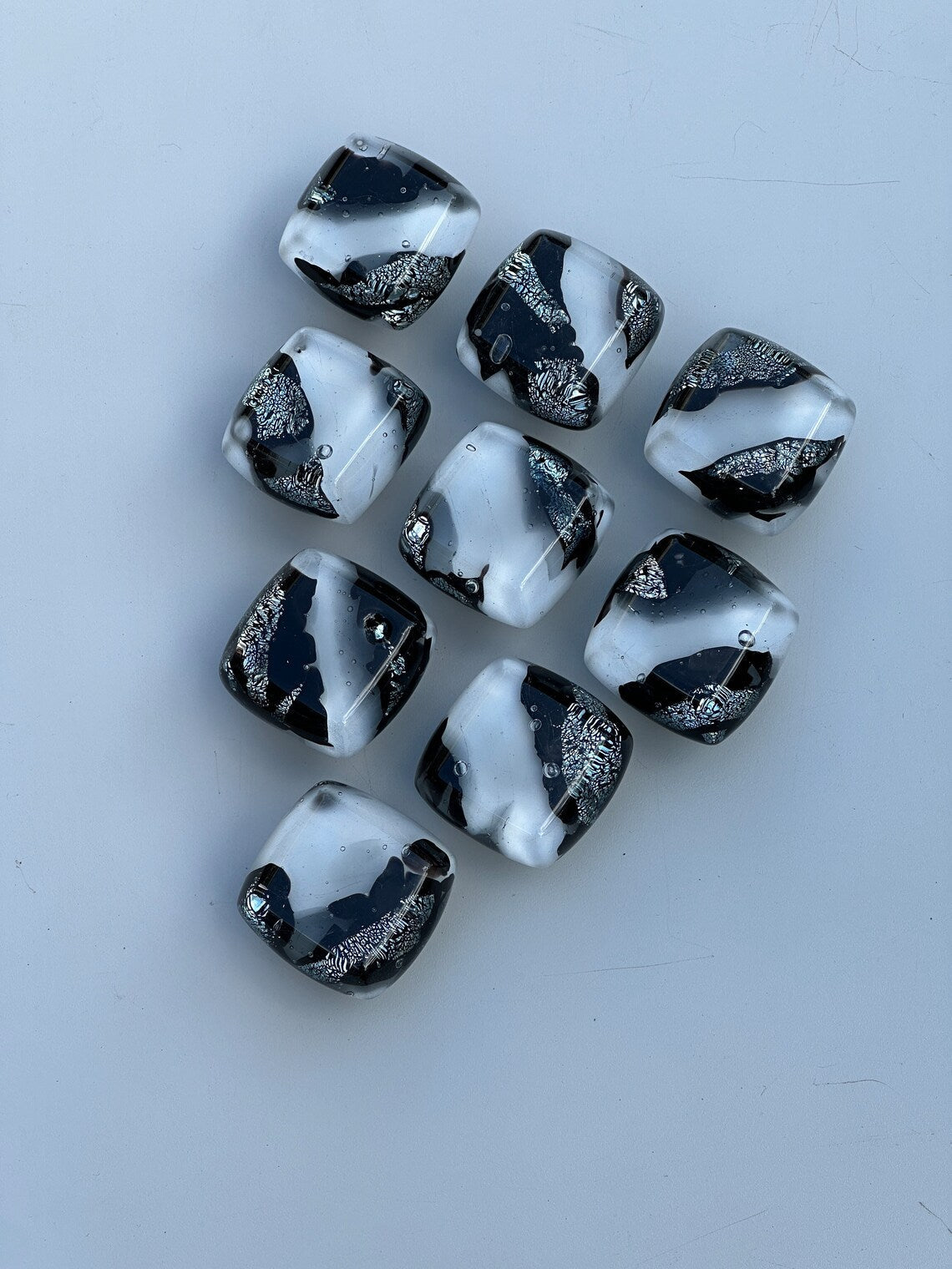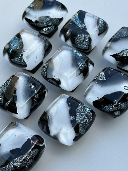 Black Ice: Silver Glass Knob features clear glass with a white background, bands of translucent grey and black interspersed with slices of sparkling silver. They would coordinate beautifully with any color furniture, working equally well on both Black and White or stainless steel.