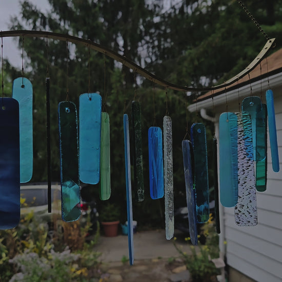 The solid brass ‘River’ is shaped by hand and holds about 19-21 chimes. They are strung with high quality beadalon, not fishing line, for longevity. The glass chimes are a mixture of salvaged stained glass, fused glass, iridized and textured glasses. Each has a handmade, veined leaf (or two) to add to the character.