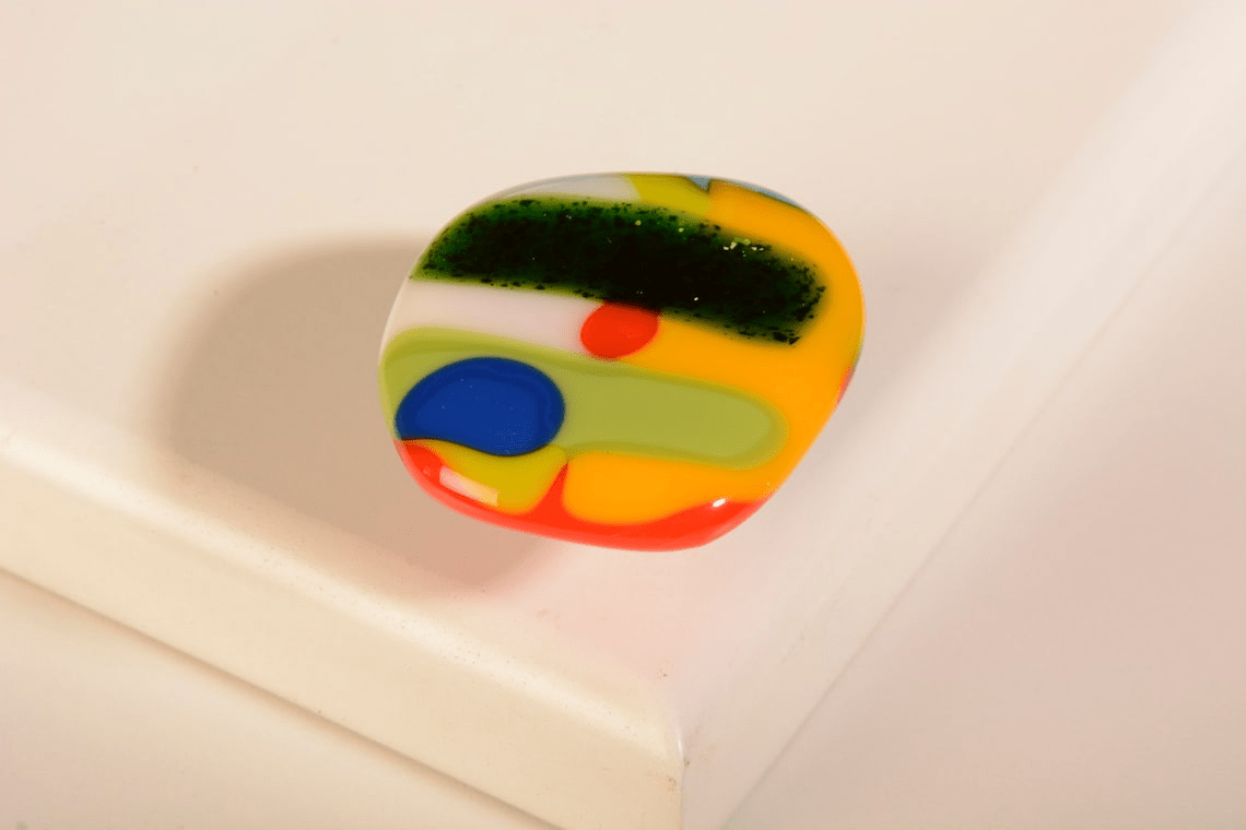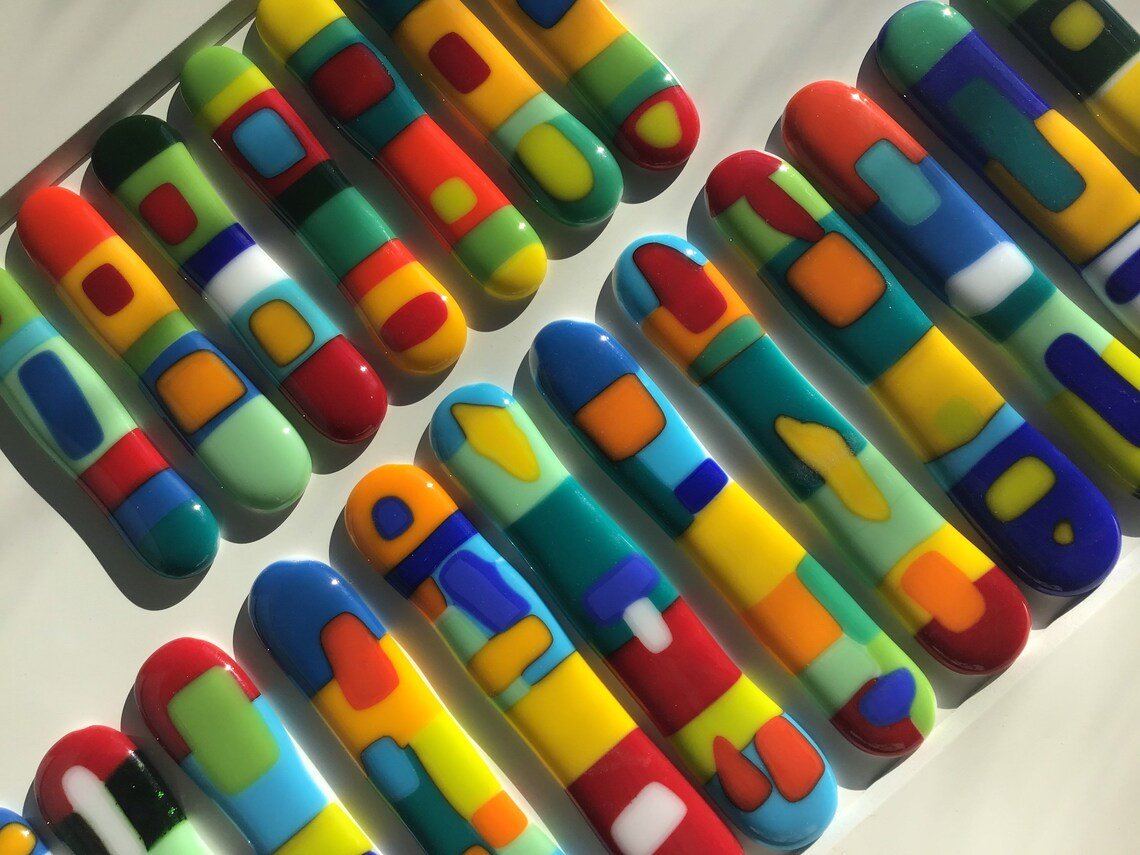 This hardware is made up of many colors that have been melted together to form an organic shape that is unique to each knob. This knob has at least 4 of 19 possible colors. Every single one is different in composition and shape.