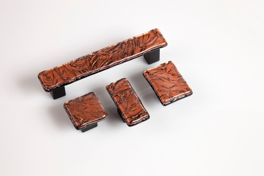 These knobs and pulls feature beautiful copper and black glass with a frost pattern. The pattern will vary on every piece. This is your chance to own something unique! No two pieces are the same.