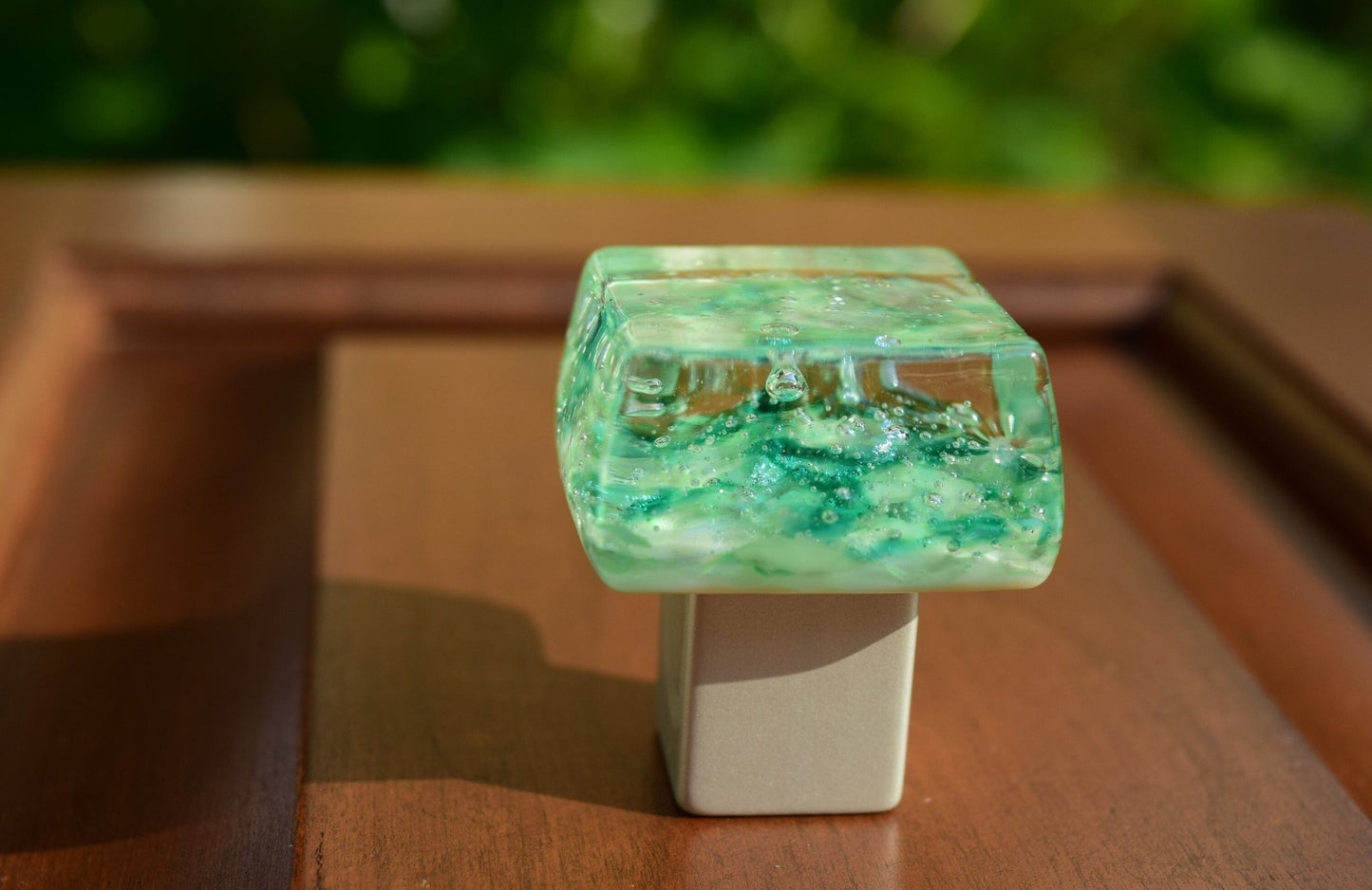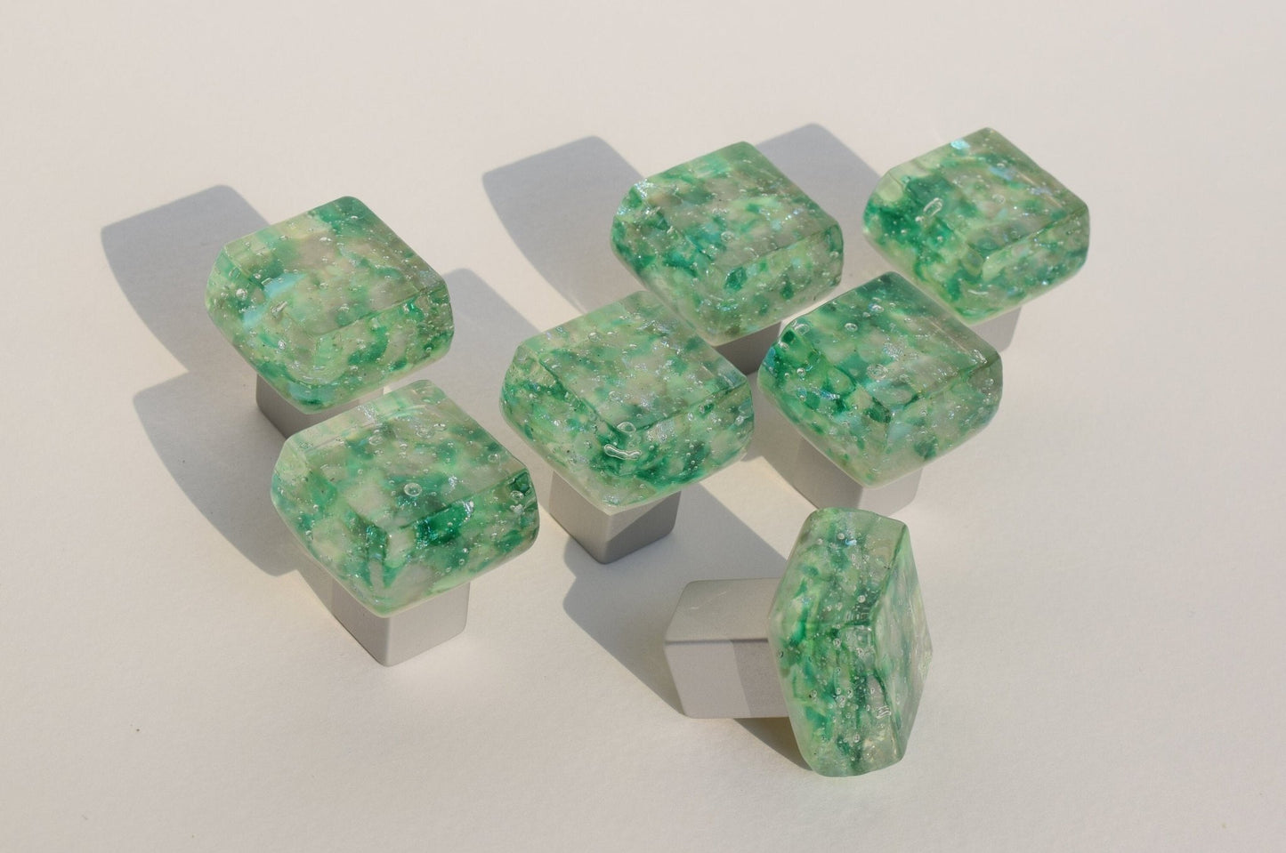 Due to the nature of fusing glass, every knob will vary slightly. Bubbles are part of the design and may create slight dips in the surface.