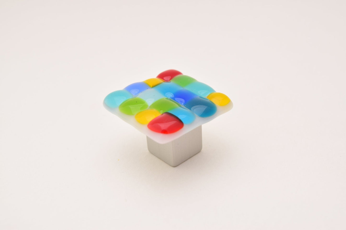 Brighten any space with this colorful and cheery hardware! Multiple squares of translucent glass over a white background with your choice of a square knob or rectangular pull shapes.
