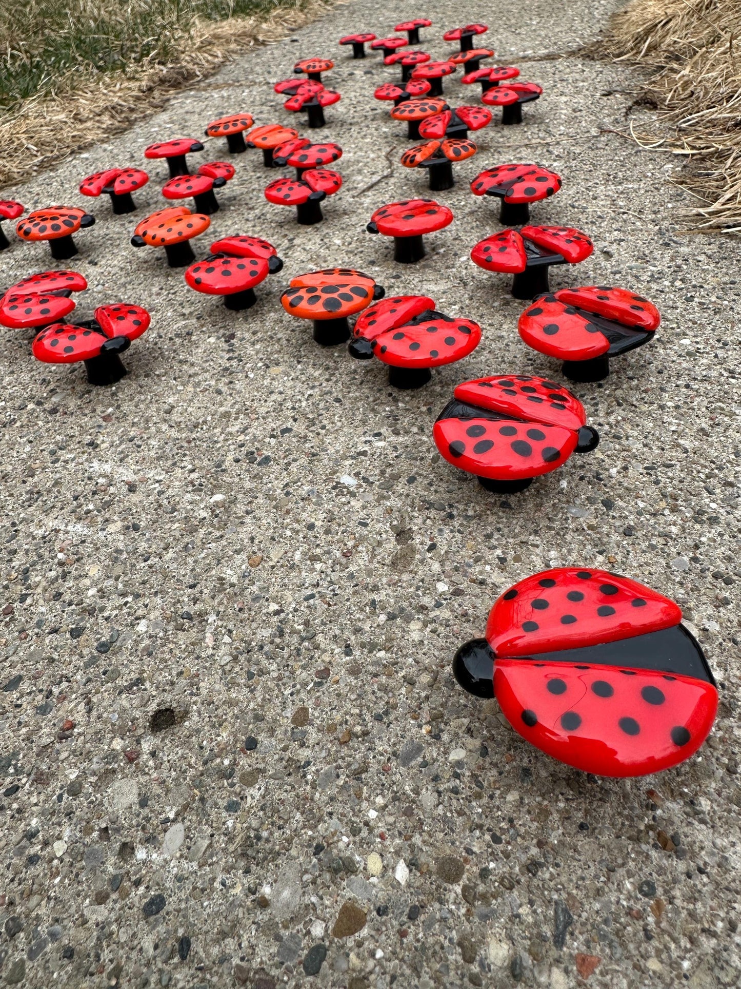 Glass Ladybug knob for a little fun on your cabinets! Each is handmade so they are all unique! Number of spots, the spread of wings and the shade of red / orange will vary.